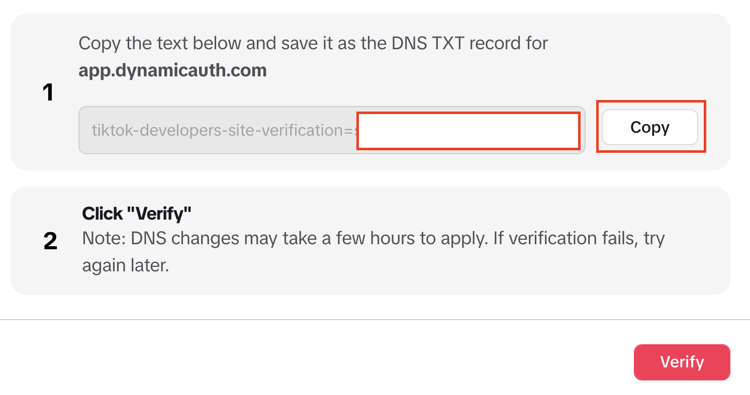1. In the next screen, click on Copy to the right of the TXT record and send it to us. After this click Verify. Note that the domain verification will not work until we have added the record on our domain